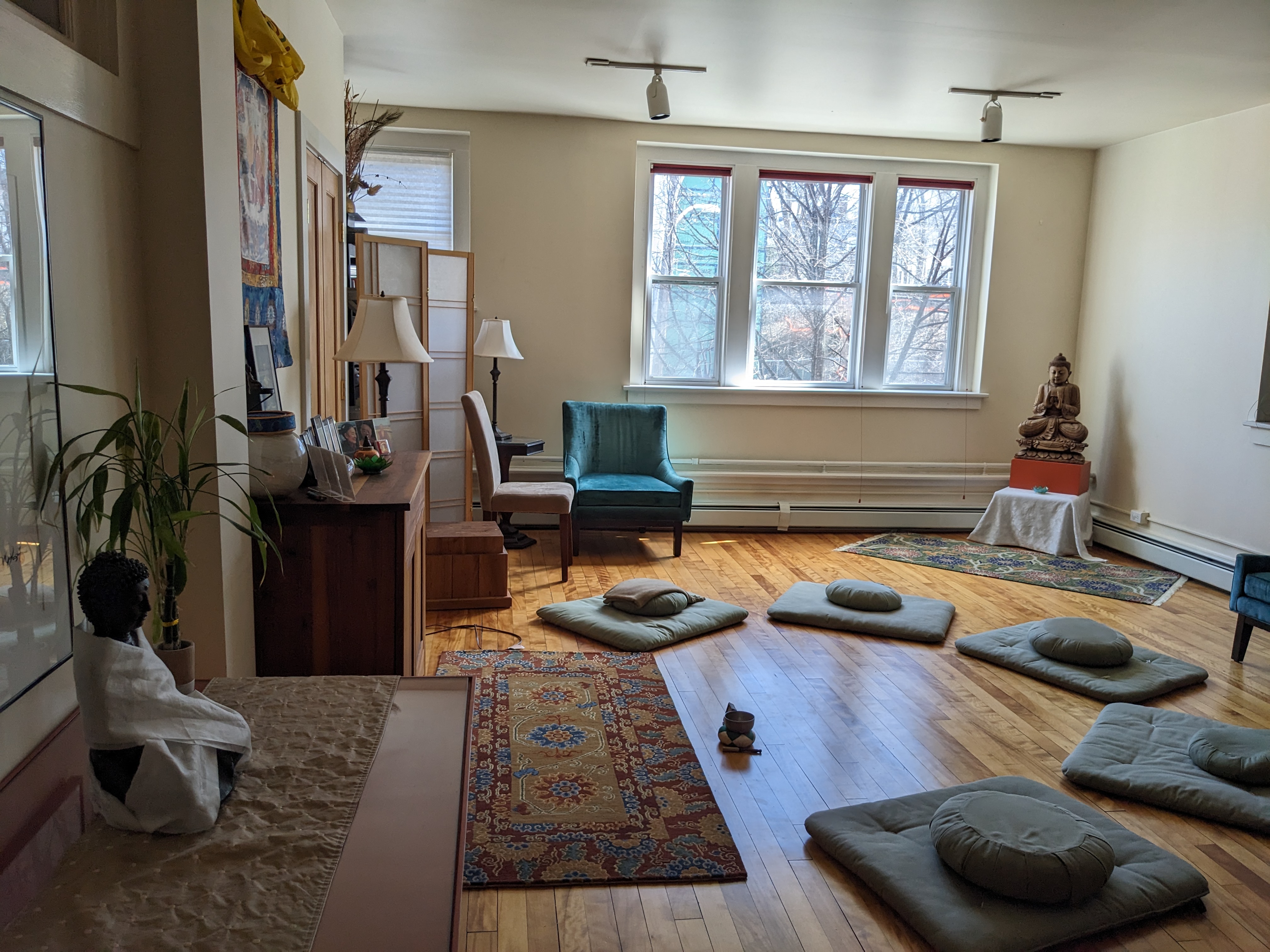 On the first, second, and third Sunday of every month, we meet in-person at in a lovely space that is part of the Shambala Center at 187 S Winooski Ave in Burlington Vermont (the building on the corner of South Winooski and King Street that reads “The Hood Plant” – our room is the door immediately on the left at the top of the stairs which reads “Breathing Bodies”).